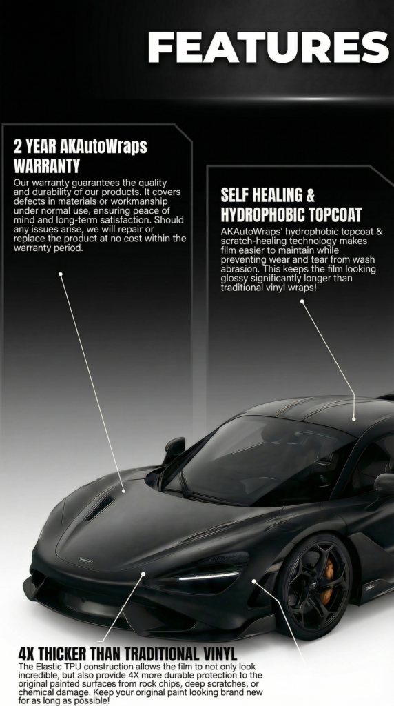 PURE PPF’s hydrophobic topcoat & scratch-healing technology makes the film easier to maintain while preventing wear and tear from wash abrasion. This keeps the film looking glossy significantly longer than traditional vinyl wraps!